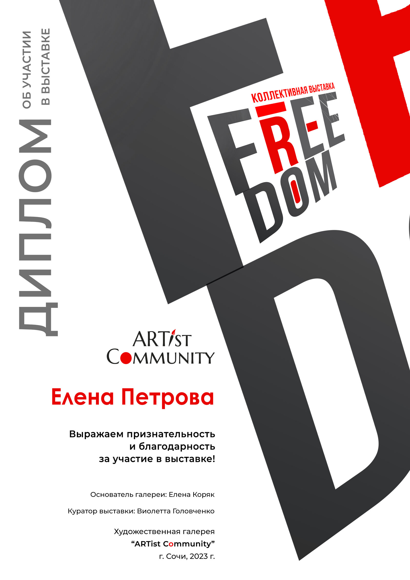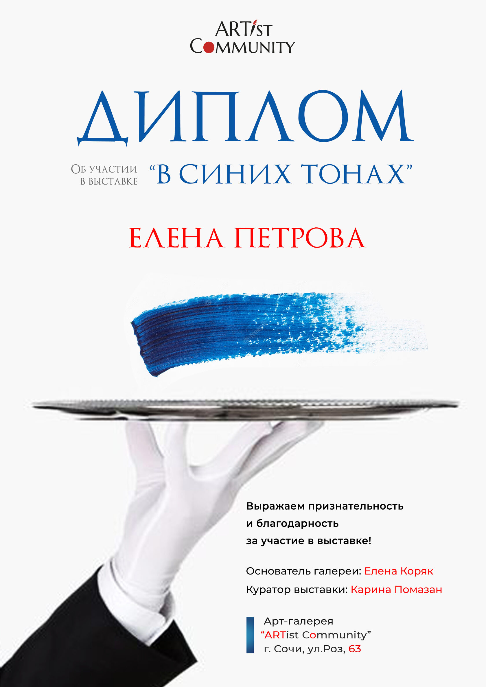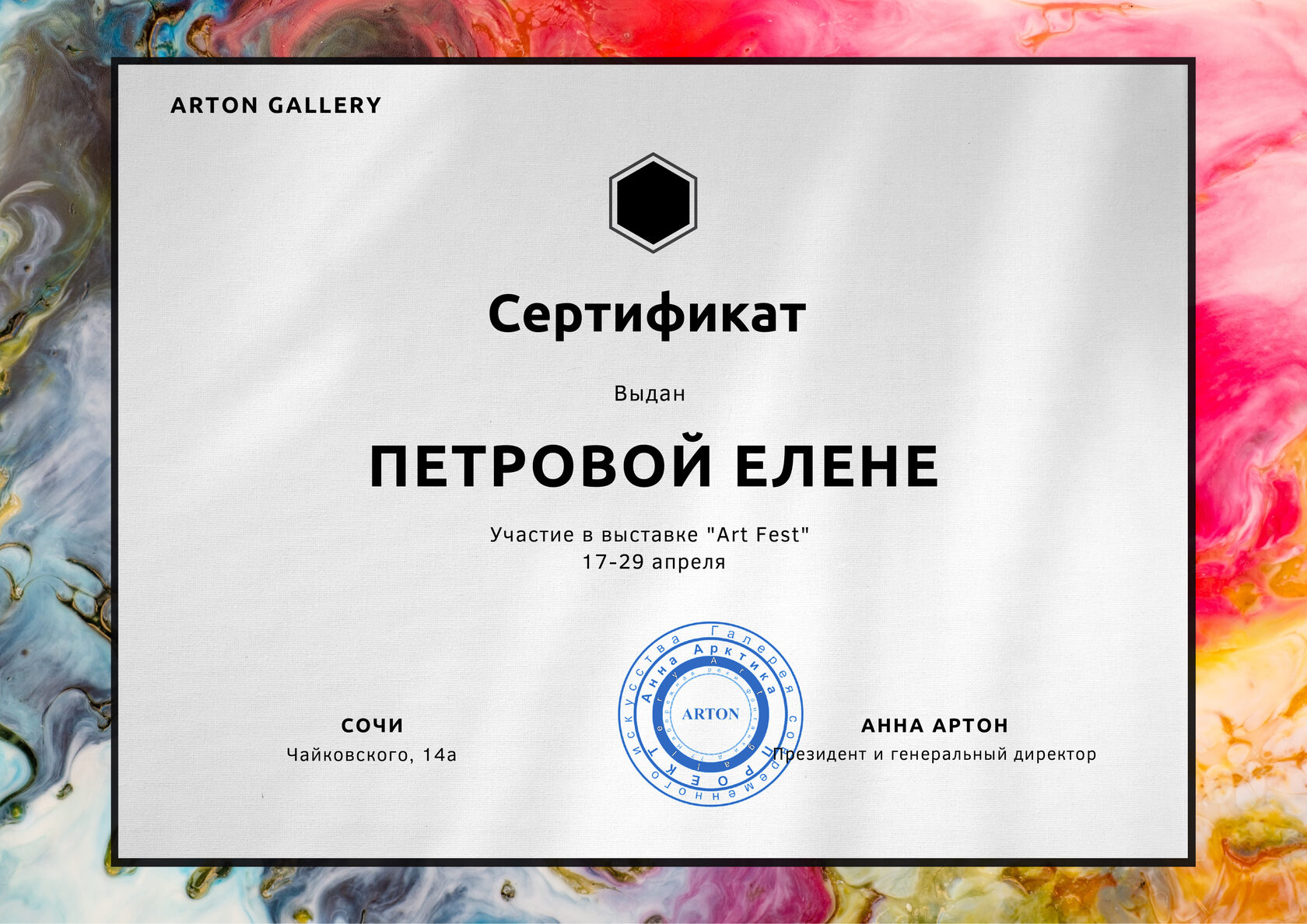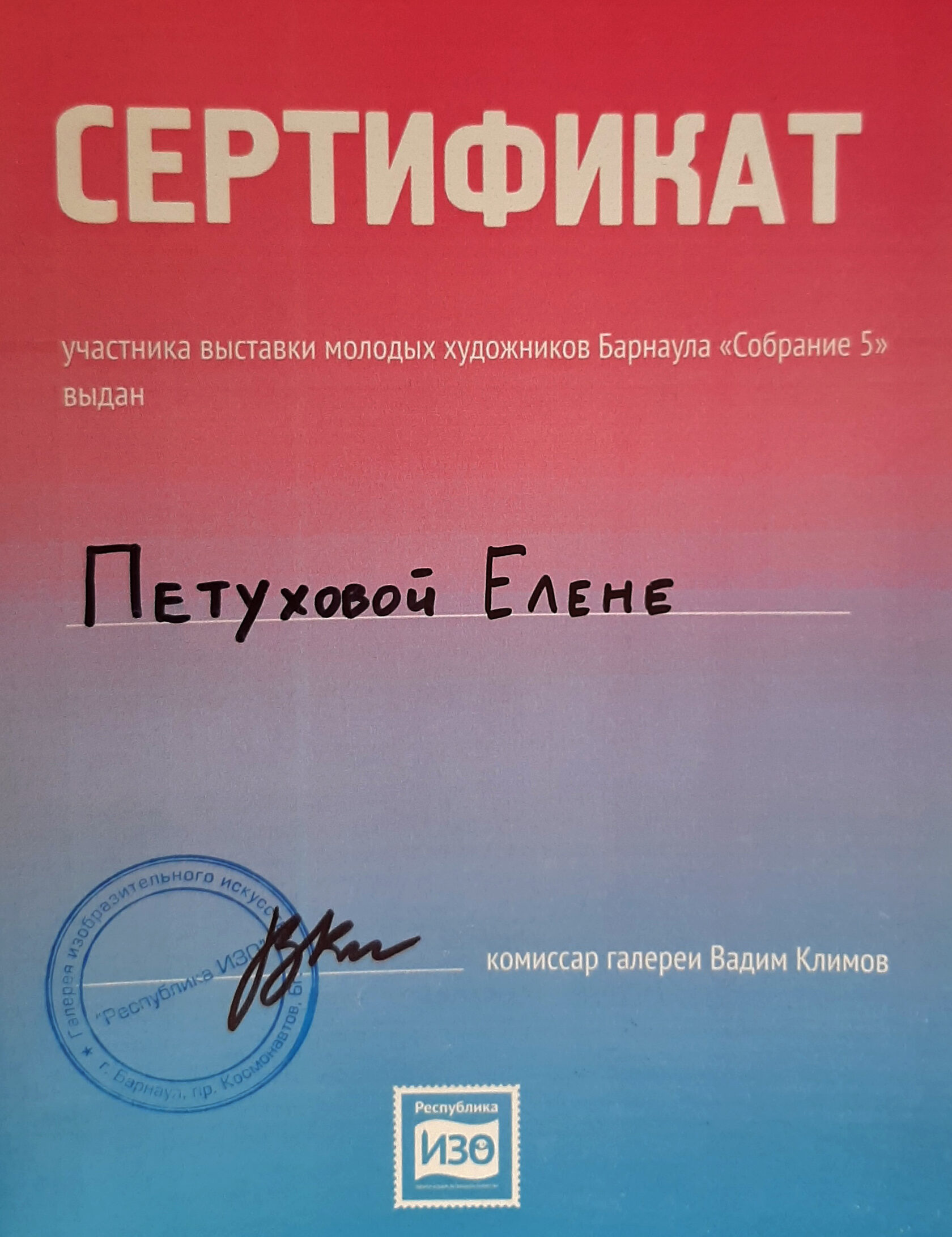 2024 - Exhibition "Samara Boat Show", Russia2024 - Exhibition at the "Castello" gallery from ARTBOXY, Venice, Italy2024 - International art project "Russian Arts Prize for 2023", Russia, Moscow2024 - International competition-festival "ART Russia week", Russia, Moscow2024 - Online exhibition "SPRING CYCLE" Creative association of artists "GRANI", Russia2023 - Exhibition "RED DOT MIAMI" Art Week from ARTBOXY, Miami, USA2023 - International competition-festival "ART Russia Week", Russia, Moscow2023 - Russian Art Festival at the Ankara Scientific Institute Russia-Turkish Week of Culture and Art, Turkey2023 - Exhibition-competition fair "ART SHOW in ASIA", Turkey2023 - Exhibition "Landscapes of the World", Sremska Mitrovica, Serbia2023 - Exhibition "Water World", Moscow, Russia2023 - Exhibition in July "OUTSIDE THE FRAMEWORK-2023", Russia2023 - Exhibition "ARTEXPO BASEL" ARTBOXY EuroAirport Basel-Mulhouse-Freiburg, Switzerland2023 - Exhibition "Arch Impulse" in the Art Gallery "Rodina" Sochi, Russia2023 - Exhibition at the ART event "People in Black" in the Art Space Business Center "Sochi Park", Sochi, Russia2023 - May Auction & Online Exhibition "Artists on the Rise", UK2023 - Exhibition "Johnathan Schultz" ARTBOXY Miami, USA2023 - Exhibition "CASA DEL ARTE PALMA" ARTBOXY Palma de Mallorca, Spain2023 - Exhibition "FINITY GALLERY" ARTBOXY Berlin, Germany2023 - Exhibition "Just summer on my mind" Miami, USA2023 - April Auction & Online Exhibition "Artists on the Rise", UK2023 - Exhibition "ARTEXPO NEW YORK" ARTBOXY New York, USA2023 - March Auction & Online Exhibition "Artists on the Rise", UK2023 - Exhibition "Spring Mood" in the Museum of Ostrovsky, Sochi, Russia2023 - Exhibition "In blue" in the gallery "ARTist Community", Sochi, Russia2023 - February Auction & Online Exhibition "Artists on the Rise", UK2023 - Exhibition "CASA DEL ARTE PALMA" ARTBOXY Palma de Mallorca, Spain2023 - Exhibition "ART LAB" ARTBOXY Los Angeles, CA, USA2023 - Exhibition "Johnathan Schultz" ARTBOXY Miami, USA2023 - Exhibition "Freedom" in the gallery "ARTist Community", Sochi, Russia2023 - Exhibition "Lelie Galerij" ARTBOXY Amsterdam, Netherlands2023 - Exhibition "Thomson Gallery" ARTBOXY Zug, Switzerland2023 - Exhibition "ART LAB" ARTBOXY Los Angeles, CA, USA2022 - Exhibition "CASA DEL ARTE PALMA" ARTBOXY, Palma, Spain2022 - Exhibition "MIAMI ARTWEEKS DECEMBER 22" Art Basel Art week, ARTBOXY, Miamy, USA2022 - Exhibition "Autumn kaleidoscope", gallery "ARTist Community" Sochi, Russia2022 - Exhibition "The world of colors without borders" gallery "ARTist Community" Sochi, Russia2022 - Virtual International Exhibition "TWO WORLDS" ECUADOR-RUSSIA2022 - International exhibition and competition of contemporary art "Talent of Russia" in the "New Tretyakov Gallery" Moscow, Russia2022 - Exhibition "Color wave" gallery "ARTON" Sochi, Russia2022 - Online exhibition "Art as a response to Mental health", UK2022 - Exhibition "ARTFest", gallery "ARTON" Sochi, Russia2022 - Online exhibition "Skies" by gallery "Colors of Humanity Gallery", USA2022 - Online exhibition "The city where the soul rests", gallery "ARTist Community", Russia2022 - Exhibition "The city where the soul rests", gallery "ARTist Community" Sochi, Russia2017 - Exhibition "Collection 5", gallery "Rebublic" Barnaul, Russia2016 - Exhibition dedicated to the 50th Barnaul art school anniversary, gallery "House Museum" Barnaul, Russia
