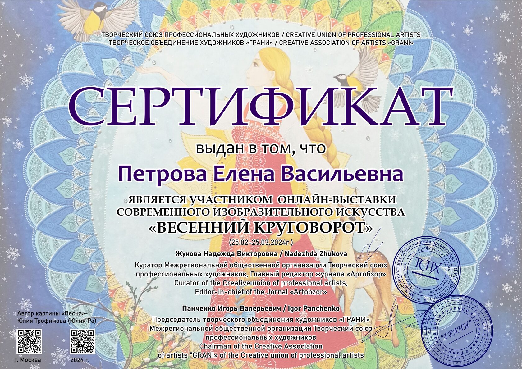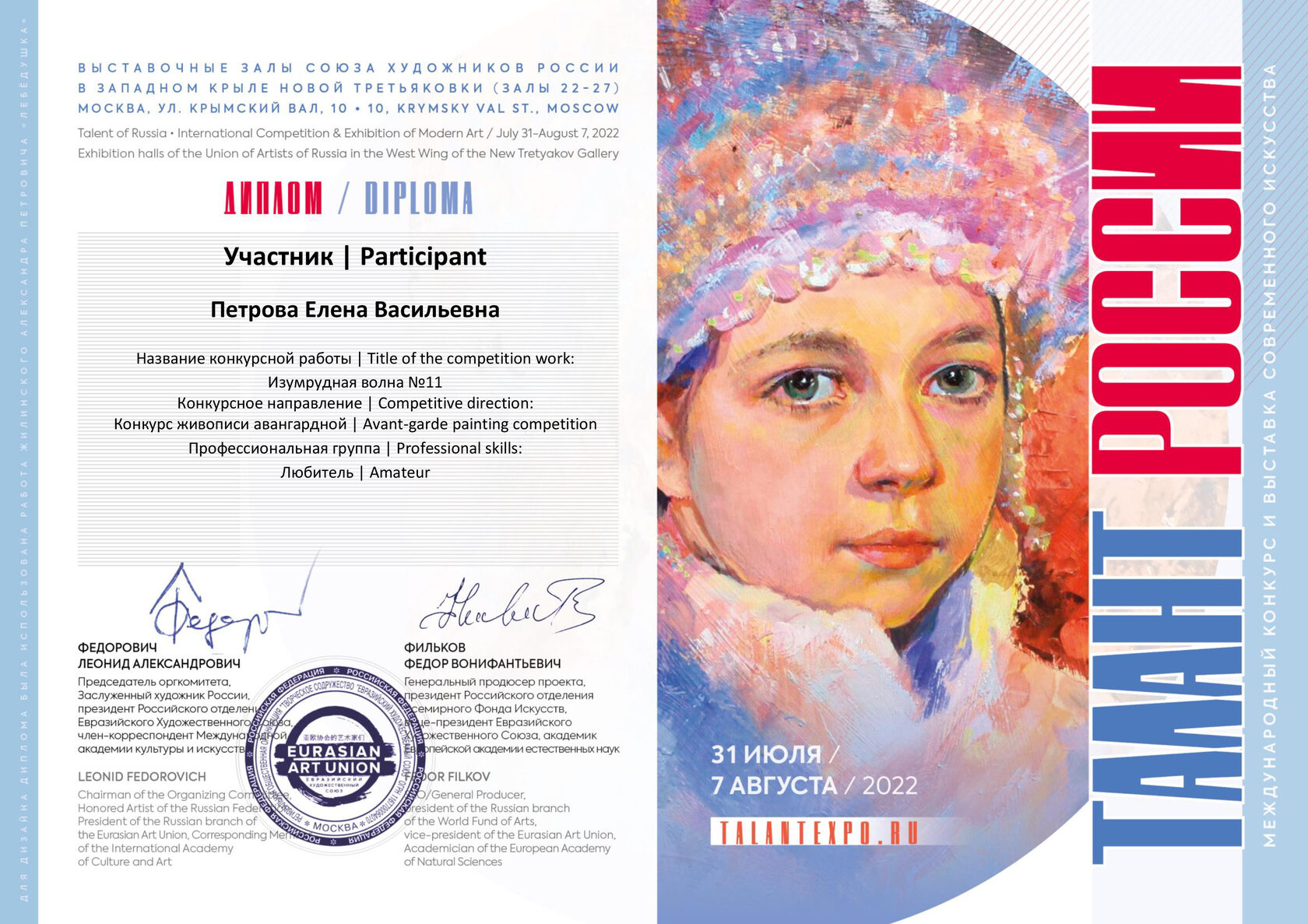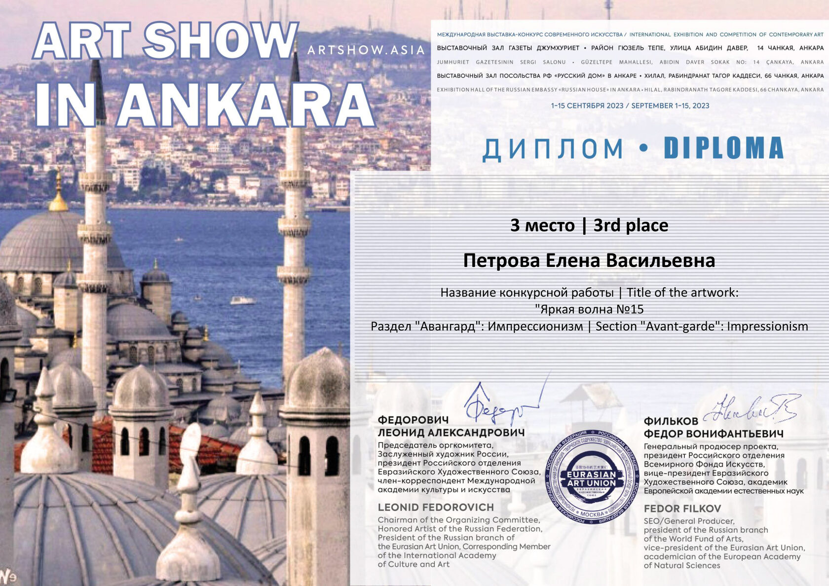 2024 - Exhibition "Samara Boat Show", Russia2024 - Exhibition at the "Castello" gallery from ARTBOXY, Venice, Italy2024 - International art project "Russian Arts Prize for 2023", Russia, Moscow2024 - International competition-festival "ART Russia week", Russia, Moscow2024 - Online exhibition "SPRING CYCLE" Creative association of artists "GRANI", Russia2023 - Exhibition "RED DOT MIAMI" Art Week from ARTBOXY, Miami, USA2023 - International competition-festival "ART Russia Week", Russia, Moscow2023 - Russian Art Festival at the Ankara Scientific Institute Russia-Turkish Week of Culture and Art, Turkey2023 - Exhibition-competition fair "ART SHOW in ASIA", Turkey2023 - Exhibition "Landscapes of the World", Sremska Mitrovica, Serbia2023 - Exhibition "Water World", Moscow, Russia2023 - Exhibition in July "OUTSIDE THE FRAMEWORK-2023", Russia2023 - Exhibition "ARTEXPO BASEL" ARTBOXY EuroAirport Basel-Mulhouse-Freiburg, Switzerland2023 - Exhibition "Arch Impulse" in the Art Gallery "Rodina" Sochi, Russia2023 - Exhibition at the ART event "People in Black" in the Art Space Business Center "Sochi Park", Sochi, Russia2023 - May Auction & Online Exhibition "Artists on the Rise", UK2023 - Exhibition "Johnathan Schultz" ARTBOXY Miami, USA2023 - Exhibition "CASA DEL ARTE PALMA" ARTBOXY Palma de Mallorca, Spain2023 - Exhibition "FINITY GALLERY" ARTBOXY Berlin, Germany2023 - Exhibition "Just summer on my mind" Miami, USA2023 - April Auction & Online Exhibition "Artists on the Rise", UK2023 - Exhibition "ARTEXPO NEW YORK" ARTBOXY New York, USA2023 - March Auction & Online Exhibition "Artists on the Rise", UK2023 - Exhibition "Spring Mood" in the Museum of Ostrovsky, Sochi, Russia2023 - Exhibition "In blue" in the gallery "ARTist Community", Sochi, Russia2023 - February Auction & Online Exhibition "Artists on the Rise", UK2023 - Exhibition "CASA DEL ARTE PALMA" ARTBOXY Palma de Mallorca, Spain2023 - Exhibition "ART LAB" ARTBOXY Los Angeles, CA, USA2023 - Exhibition "Johnathan Schultz" ARTBOXY Miami, USA2023 - Exhibition "Freedom" in the gallery "ARTist Community", Sochi, Russia2023 - Exhibition "Lelie Galerij" ARTBOXY Amsterdam, Netherlands2023 - Exhibition "Thomson Gallery" ARTBOXY Zug, Switzerland2023 - Exhibition "ART LAB" ARTBOXY Los Angeles, CA, USA2022 - Exhibition "CASA DEL ARTE PALMA" ARTBOXY, Palma, Spain2022 - Exhibition "MIAMI ARTWEEKS DECEMBER 22" Art Basel Art week, ARTBOXY, Miamy, USA2022 - Exhibition "Autumn kaleidoscope", gallery "ARTist Community" Sochi, Russia2022 - Exhibition "The world of colors without borders" gallery "ARTist Community" Sochi, Russia2022 - Virtual International Exhibition "TWO WORLDS" ECUADOR-RUSSIA2022 - International exhibition and competition of contemporary art "Talent of Russia" in the "New Tretyakov Gallery" Moscow, Russia2022 - Exhibition "Color wave" gallery "ARTON" Sochi, Russia2022 - Online exhibition "Art as a response to Mental health", UK2022 - Exhibition "ARTFest", gallery "ARTON" Sochi, Russia2022 - Online exhibition "Skies" by gallery "Colors of Humanity Gallery", USA2022 - Online exhibition "The city where the soul rests", gallery "ARTist Community", Russia2022 - Exhibition "The city where the soul rests", gallery "ARTist Community" Sochi, Russia2017 - Exhibition "Collection 5", gallery "Rebublic" Barnaul, Russia2016 - Exhibition dedicated to the 50th Barnaul art school anniversary, gallery "House Museum" Barnaul, Russia
