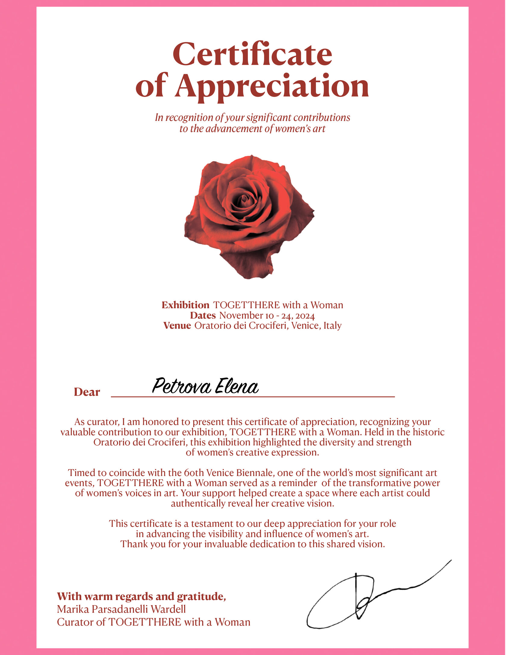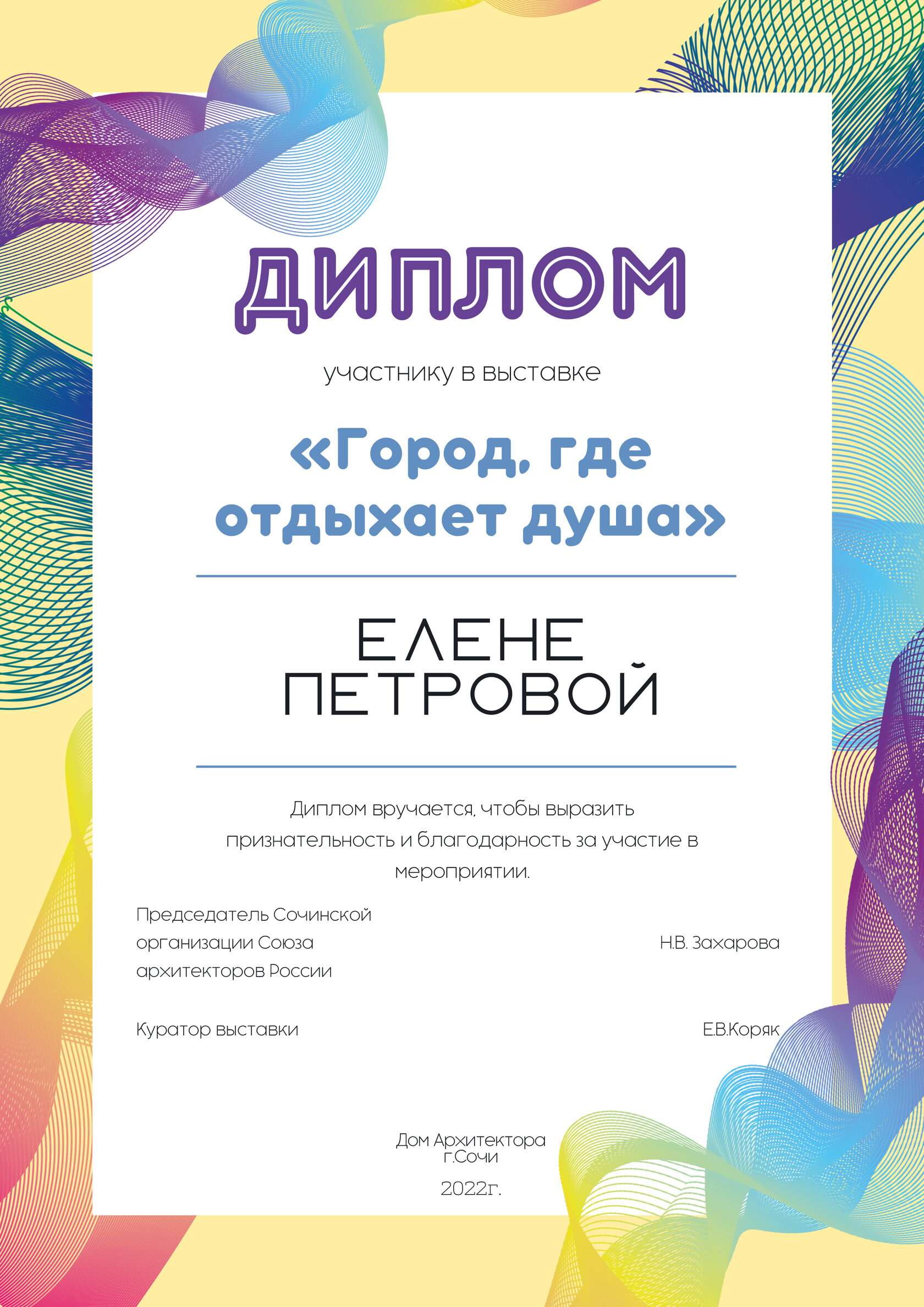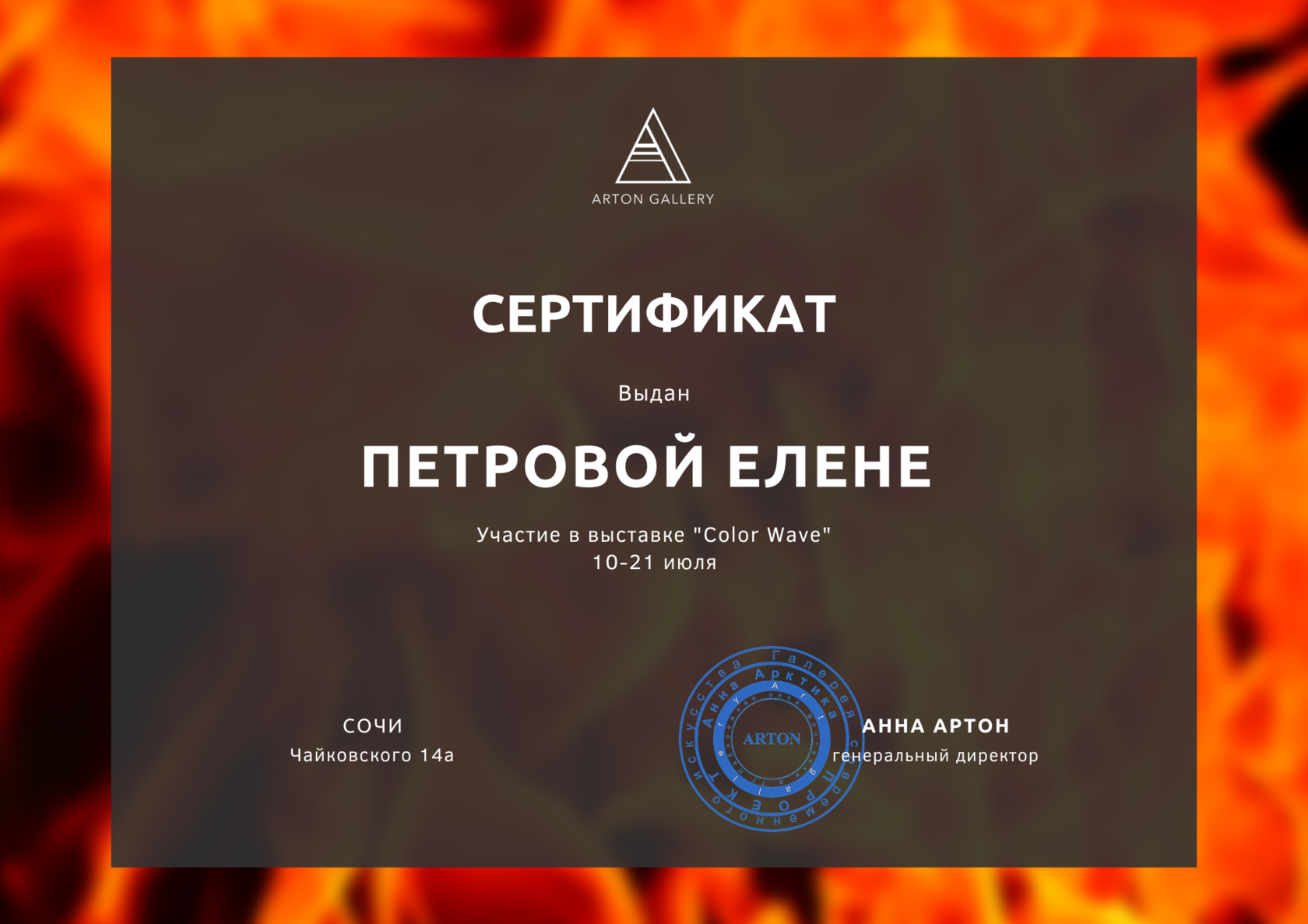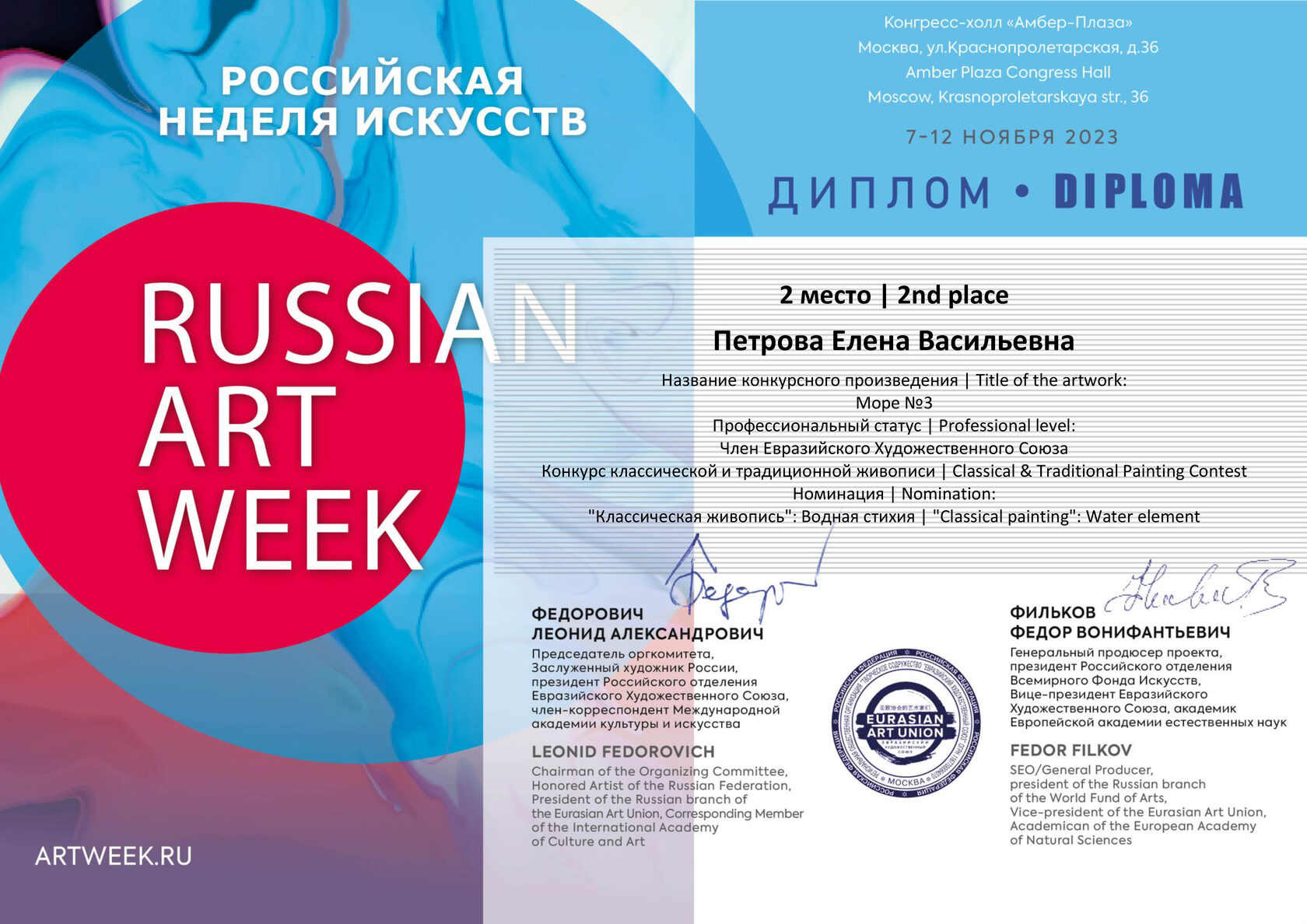 2024 - Exhibition "Samara Boat Show", Russia2024 - Exhibition at the "Castello" gallery from ARTBOXY, Venice, Italy2024 - International art project "Russian Arts Prize for 2023", Russia, Moscow2024 - International competition-festival "ART Russia week", Russia, Moscow2024 - Online exhibition "SPRING CYCLE" Creative association of artists "GRANI", Russia2023 - Exhibition "RED DOT MIAMI" Art Week from ARTBOXY, Miami, USA2023 - International competition-festival "ART Russia Week", Russia, Moscow2023 - Russian Art Festival at the Ankara Scientific Institute Russia-Turkish Week of Culture and Art, Turkey2023 - Exhibition-competition fair "ART SHOW in ASIA", Turkey2023 - Exhibition "Landscapes of the World", Sremska Mitrovica, Serbia2023 - Exhibition "Water World", Moscow, Russia2023 - Exhibition in July "OUTSIDE THE FRAMEWORK-2023", Russia2023 - Exhibition "ARTEXPO BASEL" ARTBOXY EuroAirport Basel-Mulhouse-Freiburg, Switzerland2023 - Exhibition "Arch Impulse" in the Art Gallery "Rodina" Sochi, Russia2023 - Exhibition at the ART event "People in Black" in the Art Space Business Center "Sochi Park", Sochi, Russia2023 - May Auction & Online Exhibition "Artists on the Rise", UK2023 - Exhibition "Johnathan Schultz" ARTBOXY Miami, USA2023 - Exhibition "CASA DEL ARTE PALMA" ARTBOXY Palma de Mallorca, Spain2023 - Exhibition "FINITY GALLERY" ARTBOXY Berlin, Germany2023 - Exhibition "Just summer on my mind" Miami, USA2023 - April Auction & Online Exhibition "Artists on the Rise", UK2023 - Exhibition "ARTEXPO NEW YORK" ARTBOXY New York, USA2023 - March Auction & Online Exhibition "Artists on the Rise", UK2023 - Exhibition "Spring Mood" in the Museum of Ostrovsky, Sochi, Russia2023 - Exhibition "In blue" in the gallery "ARTist Community", Sochi, Russia2023 - February Auction & Online Exhibition "Artists on the Rise", UK2023 - Exhibition "CASA DEL ARTE PALMA" ARTBOXY Palma de Mallorca, Spain2023 - Exhibition "ART LAB" ARTBOXY Los Angeles, CA, USA2023 - Exhibition "Johnathan Schultz" ARTBOXY Miami, USA2023 - Exhibition "Freedom" in the gallery "ARTist Community", Sochi, Russia2023 - Exhibition "Lelie Galerij" ARTBOXY Amsterdam, Netherlands2023 - Exhibition "Thomson Gallery" ARTBOXY Zug, Switzerland2023 - Exhibition "ART LAB" ARTBOXY Los Angeles, CA, USA2022 - Exhibition "CASA DEL ARTE PALMA" ARTBOXY, Palma, Spain2022 - Exhibition "MIAMI ARTWEEKS DECEMBER 22" Art Basel Art week, ARTBOXY, Miamy, USA2022 - Exhibition "Autumn kaleidoscope", gallery "ARTist Community" Sochi, Russia2022 - Exhibition "The world of colors without borders" gallery "ARTist Community" Sochi, Russia2022 - Virtual International Exhibition "TWO WORLDS" ECUADOR-RUSSIA2022 - International exhibition and competition of contemporary art "Talent of Russia" in the "New Tretyakov Gallery" Moscow, Russia2022 - Exhibition "Color wave" gallery "ARTON" Sochi, Russia2022 - Online exhibition "Art as a response to Mental health", UK2022 - Exhibition "ARTFest", gallery "ARTON" Sochi, Russia2022 - Online exhibition "Skies" by gallery "Colors of Humanity Gallery", USA2022 - Online exhibition "The city where the soul rests", gallery "ARTist Community", Russia2022 - Exhibition "The city where the soul rests", gallery "ARTist Community" Sochi, Russia2017 - Exhibition "Collection 5", gallery "Rebublic" Barnaul, Russia2016 - Exhibition dedicated to the 50th Barnaul art school anniversary, gallery "House Museum" Barnaul, Russia
