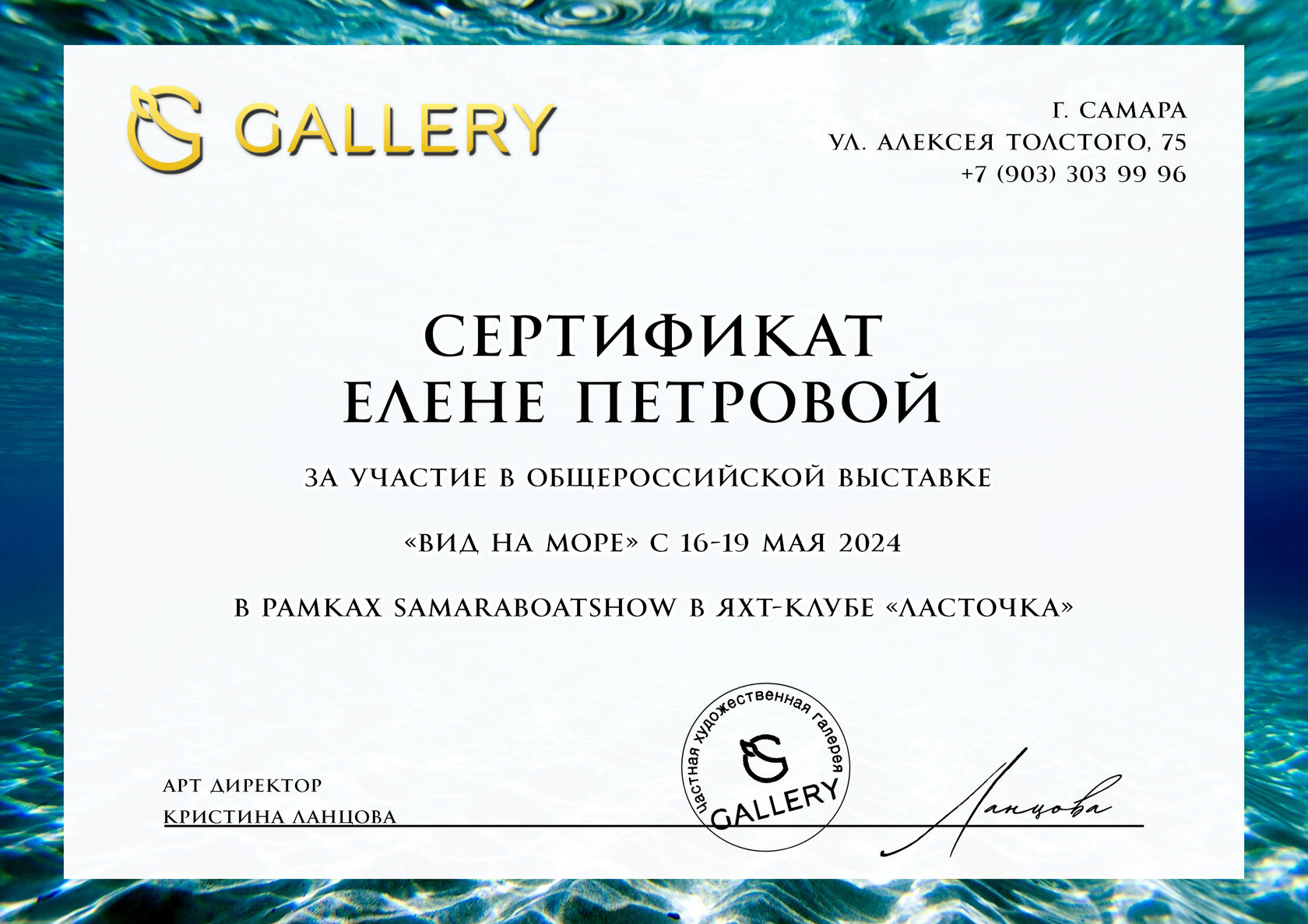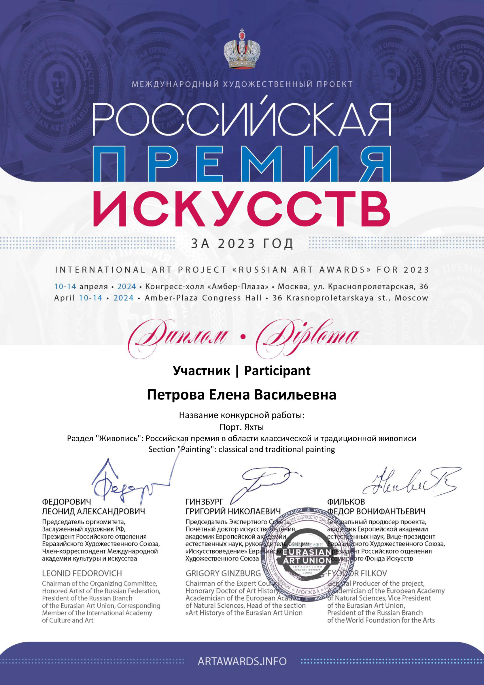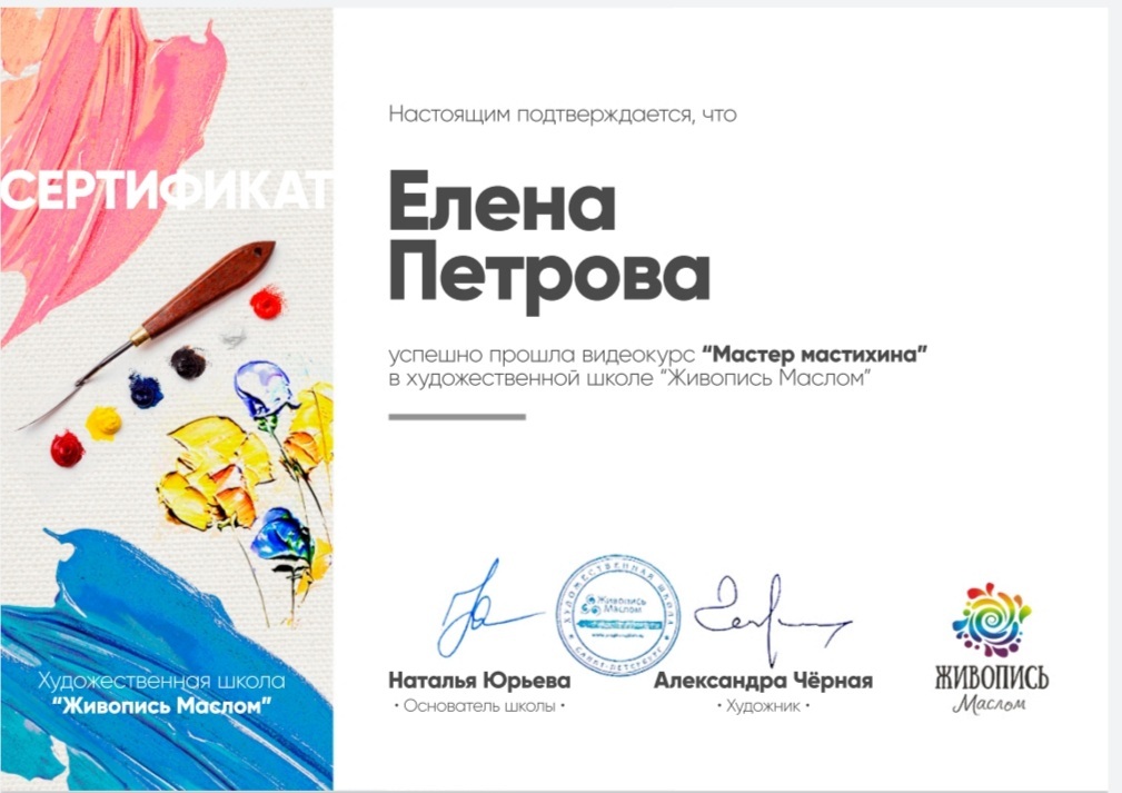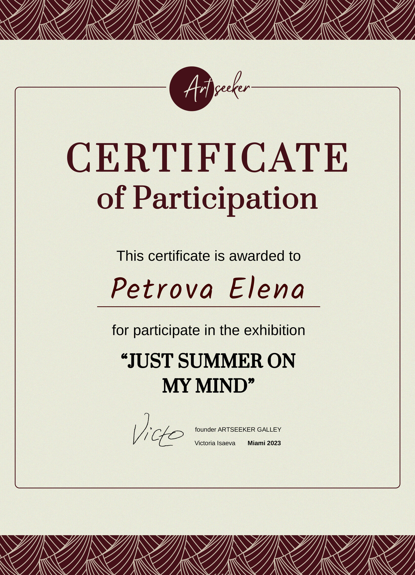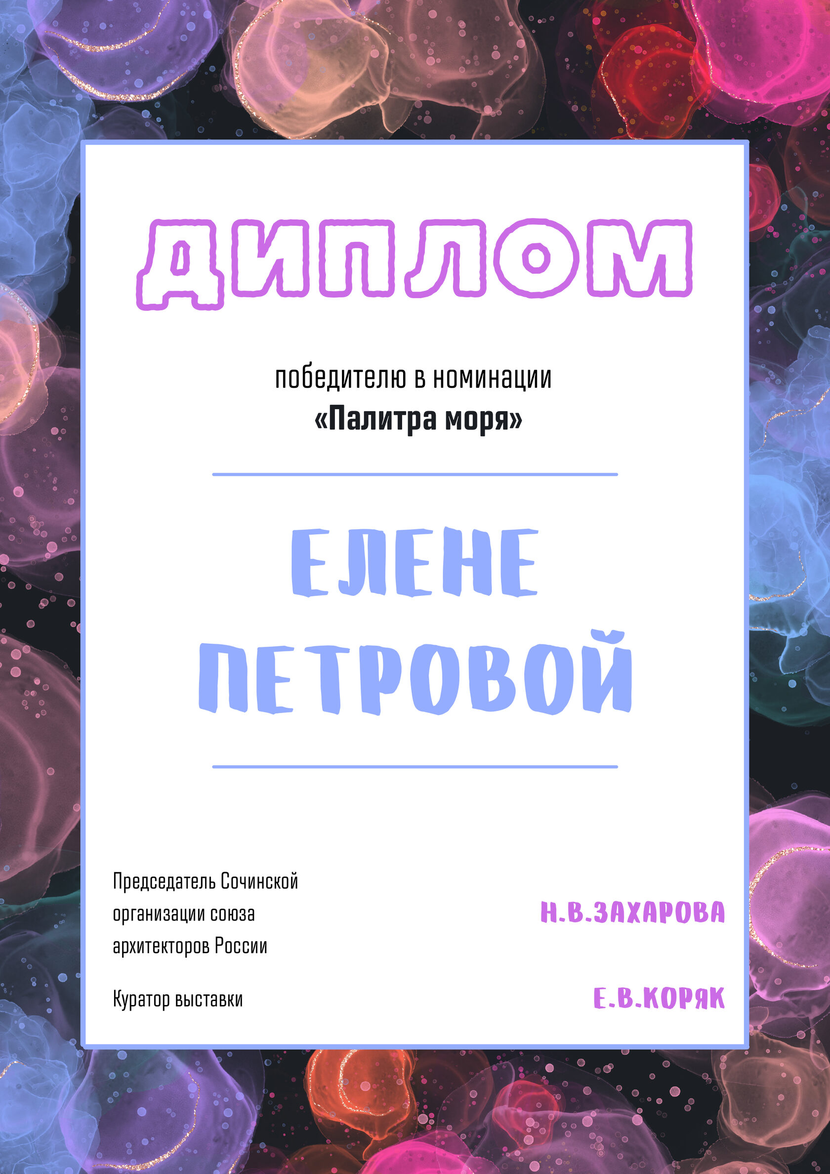 My name is Elena Petrova. I was born in 1982.I am a professional artist, I am a member of the Professional Union of Artists, Creative Union of Professional Artists and the Eurasian Art Union. I live and work in Russia. Originally from Siberia from a small town in the Novosibirsk region. I lived for many years in Barnaul. But because of their love for the sea, they moved to live in Sochi.I painted my first oil painting at the age of 10. At that time, I didn't think I would connect my life with drawing.In 2000, I entered the railway institute.In 2005, I got a job on the railway for distribution in Barnaul to my future husband.In 2012, I quit my job to open my an online craft store.In 2014, I sold the store and went with my husband to the sea, where I began to paint pictures. I went to study at master classes, where I remembered oil paints and canvases.In 2015, I returned to Barnaul and entered the evening department of Barnaul Children's Art School No. 1.In 2018, I went on maternity leave and gave birth to my long-awaited son Stepan.In 2020 we will finally move to Sochi. There I begin to learn palette knife painting online.The sea and the palette knife are my passion. These are paintings filled with life and energy.In 2022, I am starting to study soft pastels.In 2022, she gained experience as an exhibition curator in the film "Artist Community".In 2023, he was selected for "The Other Art Fair Los Angeles Spring 2023" by Saatchi Art.In 2025, I went on maternity leave and gave birth to my long-awaited daughter Natasha..I paint in oil on canvas or dry pastel on paper. At the moment, more than 100 paintings and drawings have been painted, more than 7 years of working with orders. I study the influence of the sea on the human condition. My paintings are in private collections, houses and offices in Russia, UK, Romania, Singapore. Featured in online galleries such as SaatchiArt and Artmajeur.My goal is to become a selling artist in my lifetime. I want everyone in their home or office to have my painting, symbolizing individuality, freedom and strength.Education:2023 - Online course "School of the marine painter", art school "Oil Painting"2022 - Online course "About the sea, the sea", art school "Oil Painting"2020 - Online course "Palette knife master", art school "Oil painting"2015-2017 - Evening department of the Barnaul Children's Art School No. 12000-2005 - Engineer, Siberian State Transport UniversityContests/Auction:2025 - Participation in the expert jury July2025 - participation in the expert jury of the International Festival of Children's and Youth Creativity "Russian Cup in Moscow" spring-2025 2024 - participation in the expert jury of the International Competition Festival of Children's and Youth Creativity "Talented Planet"2024 - participation in the expert jury of the International Festival of Children and Youth Creativity "Russian Cup in Moscow" 2024 - participation in the organization of the exhibition “TOGETHER WITH WOMAN” dedicated to the 60th Venice Biennale, Venice, Italy2024 - The painting "Port. Yachts No. 2" participated and took 1st place in the international exhibition-competition "ART EXPO in CHINA", China2024 - "Charity auction" from Artsreda, Russia (1 sold)2023 - The painting "Sea № 3" took part and took 2nd place in the International competition-festival "ART Russia Week", Russia 2023 - Auction "Contemporary Art. The Magic of Nature" from Artsreda, Russia (1 sold)2023 - Participant in the "Artists on the Rise" auction in the UK (1 sold)2023 - The painting "Vivid wave №15" participated and took 3rd place in the international exhibition-competition fair "ART SHOW in ASIA", Turkey2023 - The painting "Sunset №4" participated and took 3rd place at the international exhibition-competition "Landscapes of the World", Sremska Mitrovica, Serbia2023 - "Artists on the Rise" auction bidder, UK (1 sold)2022 - "Artists on the Rise" auction bidder, UK (2 sold)2022 - The painting "Palm trees №2" and "Sea shaking. Storm" participate in"Skies" from the gallery Colors of Humanity2021 - The painting "Wave. Ocean" took part in the competition GOLDEN TIME TALENT 1st place 26th season2020 - The painting "Orchid" took 6th place in the American Art Awards2020 - The painting "Valencia" participated in "The 2020 Water/Seascape Exhibition"2017 - The painting "Provence" won first place in the competition "The House of the Sun" in TurkeyPublications:2025 - Printed in the book "You Can Be Who You Choose" by Victo2023 - Publication about me on the Artist's Gallery website2023 - Publication on "Ya. Dzen" before the auction from ARTSreda2023 - Publication about Artseeker gallery on the "News God" website2023 - Publication of an article from ArtPatrol in the telegram channel2023 - Printed in the book "Artists of the 21st century"2023 - Publication about the exhibition "Just summer on my mind" in Miami on the website Glamourbuff.com2022 - Printing in the magazine "Fashion Academy" spring 20222020 - Publication of the work "Orchid" on the American Art Awards website and press releaseFull list of exhibitions:2025 - Exhibition "Summer Gradient", IZOTOP, Sochi, Russia (July) 2025 - Exhibition "Wings of Inspiration", Kolibri, Sochi, Russia2024 - International exhibition and competition of contemporary art “ART EXPO in CHINA”, China2024 - Exhibition “Summer is here” Moscow, Russia 2024 - Exhibition at the festival "Sochi - a big good family", Sochi, Russia 2024 - Exhibition "ARTEXPO BASEL" ARTBOXY EuroAirport Basel-Mulhouse-Freiburg, Switzerland