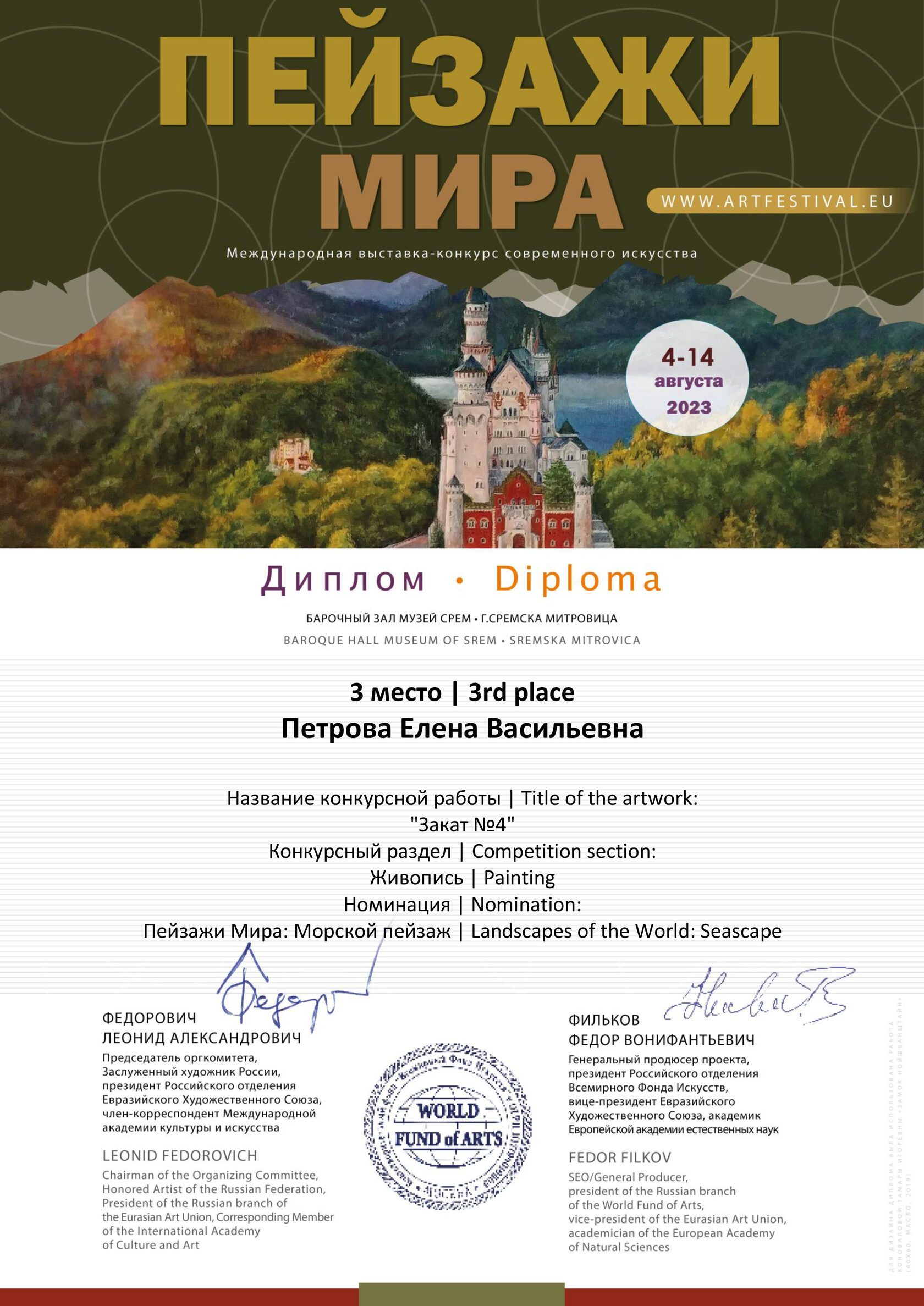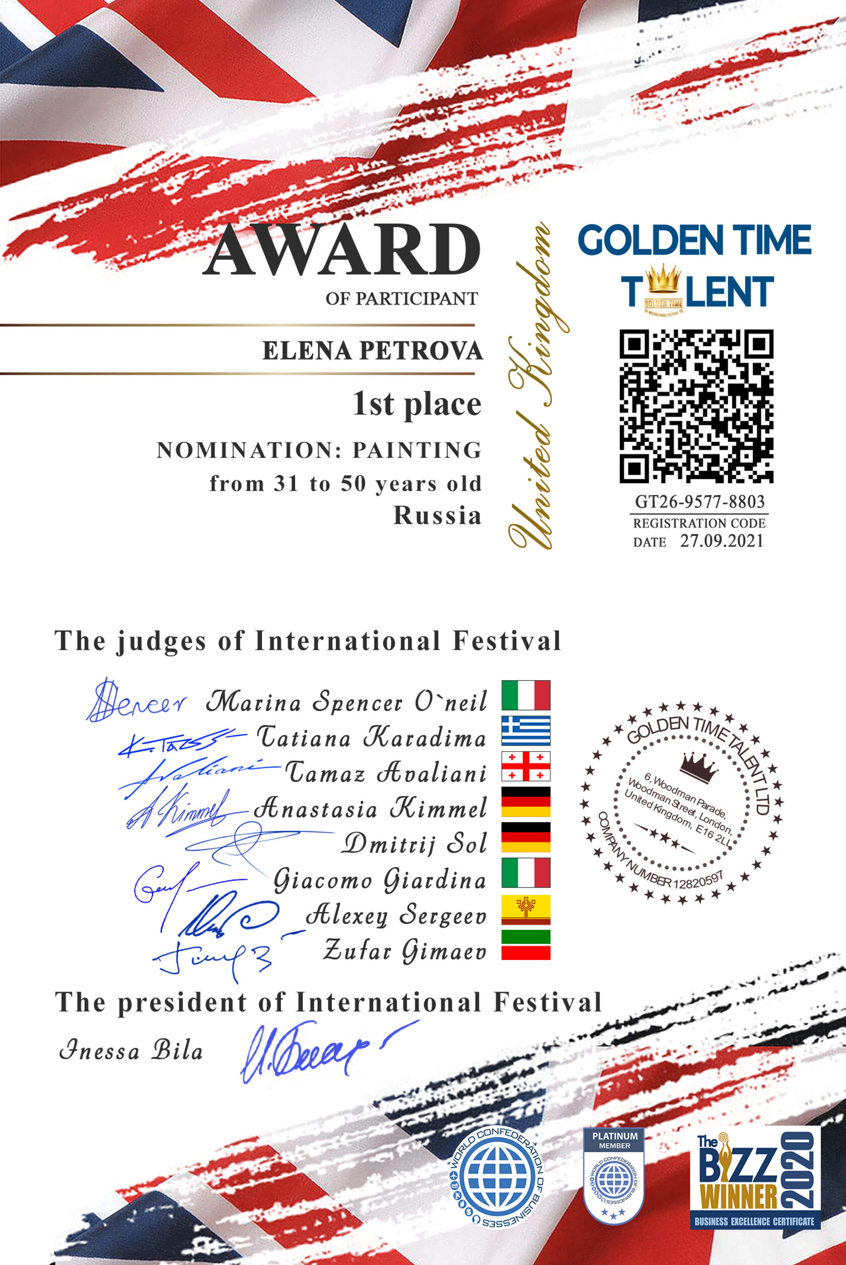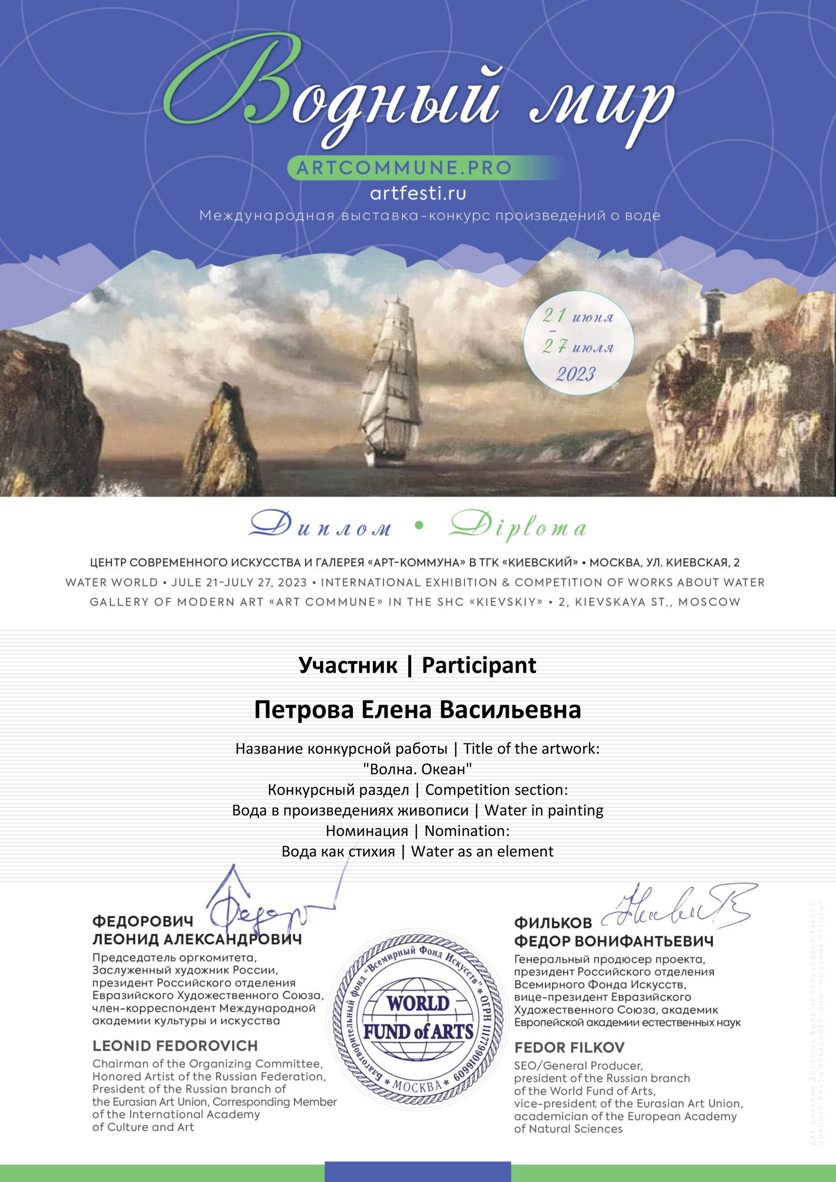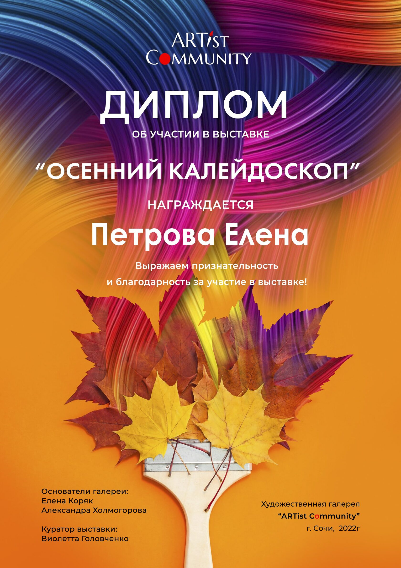 My name is Elena Petrova. I was born in 1982.I am a professional artist, I am a member of the Professional Union of Artists, Creative Union of Professional Artists and the Eurasian Art Union. I live and work in Russia. Originally from Siberia from a small town in the Novosibirsk region. I lived for many years in Barnaul. But because of their love for the sea, they moved to live in Sochi.I painted my first oil painting at the age of 10. At that time, I didn't think I would connect my life with drawing.In 2000, I entered the railway institute.In 2005, I got a job on the railway for distribution in Barnaul to my future husband.In 2012, I quit my job to open my an online craft store.In 2014, I sold the store and went with my husband to the sea, where I began to paint pictures. I went to study at master classes, where I remembered oil paints and canvases.In 2015, I returned to Barnaul and entered the evening department of Barnaul Children's Art School No. 1.In 2018, I went on maternity leave and gave birth to my long-awaited son Stepan.In 2020 we will finally move to Sochi. There I begin to learn palette knife painting online.The sea and the palette knife are my passion. These are paintings filled with life and energy.In 2022, I am starting to study soft pastels.In 2022, she gained experience as an exhibition curator in the film "Artist Community".In 2023, he was selected for "The Other Art Fair Los Angeles Spring 2023" by Saatchi Art.In 2025, I went on maternity leave and gave birth to my long-awaited daughter Natasha..I paint in oil on canvas or dry pastel on paper. At the moment, more than 100 paintings and drawings have been painted, more than 7 years of working with orders. I study the influence of the sea on the human condition. My paintings are in private collections, houses and offices in Russia, UK, Romania, Singapore. Featured in online galleries such as SaatchiArt and Artmajeur.My goal is to become a selling artist in my lifetime. I want everyone in their home or office to have my painting, symbolizing individuality, freedom and strength.Education:2023 - Online course "School of the marine painter", art school "Oil Painting"2022 - Online course "About the sea, the sea", art school "Oil Painting"2020 - Online course "Palette knife master", art school "Oil painting"2015-2017 - Evening department of the Barnaul Children's Art School No. 12000-2005 - Engineer, Siberian State Transport UniversityContests/Auction:2025 - Participation in the expert jury July2025 - participation in the expert jury of the International Festival of Children's and Youth Creativity "Russian Cup in Moscow" spring-2025 2024 - participation in the expert jury of the International Competition Festival of Children's and Youth Creativity "Talented Planet"2024 - participation in the expert jury of the International Festival of Children and Youth Creativity "Russian Cup in Moscow" 2024 - participation in the organization of the exhibition “TOGETHER WITH WOMAN” dedicated to the 60th Venice Biennale, Venice, Italy2024 - The painting "Port. Yachts No. 2" participated and took 1st place in the international exhibition-competition "ART EXPO in CHINA", China2024 - "Charity auction" from Artsreda, Russia (1 sold)2023 - The painting "Sea № 3" took part and took 2nd place in the International competition-festival "ART Russia Week", Russia 2023 - Auction "Contemporary Art. The Magic of Nature" from Artsreda, Russia (1 sold)2023 - Participant in the "Artists on the Rise" auction in the UK (1 sold)2023 - The painting "Vivid wave №15" participated and took 3rd place in the international exhibition-competition fair "ART SHOW in ASIA", Turkey2023 - The painting "Sunset №4" participated and took 3rd place at the international exhibition-competition "Landscapes of the World", Sremska Mitrovica, Serbia2023 - "Artists on the Rise" auction bidder, UK (1 sold)2022 - "Artists on the Rise" auction bidder, UK (2 sold)2022 - The painting "Palm trees №2" and "Sea shaking. Storm" participate in"Skies" from the gallery Colors of Humanity2021 - The painting "Wave. Ocean" took part in the competition GOLDEN TIME TALENT 1st place 26th season2020 - The painting "Orchid" took 6th place in the American Art Awards2020 - The painting "Valencia" participated in "The 2020 Water/Seascape Exhibition"2017 - The painting "Provence" won first place in the competition "The House of the Sun" in TurkeyPublications:2025 - Printed in the book "You Can Be Who You Choose" by Victo2023 - Publication about me on the Artist's Gallery website2023 - Publication on "Ya. Dzen" before the auction from ARTSreda2023 - Publication about Artseeker gallery on the "News God" website2023 - Publication of an article from ArtPatrol in the telegram channel2023 - Printed in the book "Artists of the 21st century"2023 - Publication about the exhibition "Just summer on my mind" in Miami on the website Glamourbuff.com2022 - Printing in the magazine "Fashion Academy" spring 20222020 - Publication of the work "Orchid" on the American Art Awards website and press releaseFull list of exhibitions:2025 - Exhibition "Summer Gradient", IZOTOP, Sochi, Russia (July) 2025 - Exhibition "Wings of Inspiration", Kolibri, Sochi, Russia2024 - International exhibition and competition of contemporary art “ART EXPO in CHINA”, China2024 - Exhibition “Summer is here” Moscow, Russia 2024 - Exhibition at the festival "Sochi - a big good family", Sochi, Russia 2024 - Exhibition "ARTEXPO BASEL" ARTBOXY EuroAirport Basel-Mulhouse-Freiburg, Switzerland